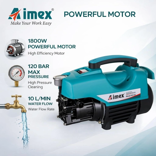 The Aimex D3 1800W High Pressure Washer is a powerful and efficient cleaning solution designed for car washing and home maintenance. With 120 bar high-pressure output and a strong 10L/min water flow, it quickly removes stubborn dirt, mud, grease, and road grime from vehicles and outdoor surfaces. The high-performance motor ensures consistent pressure while maintaining energy efficiency and reliable operation.