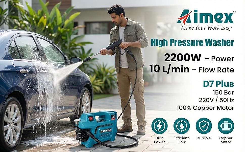 Aimex D7 Plus Electric High Pressure Car Washer 2200W | 150 Bar Pressure Washer with Copper Winding | Portable Car & Home Cleaning Machine with 10M Hose (Blue)