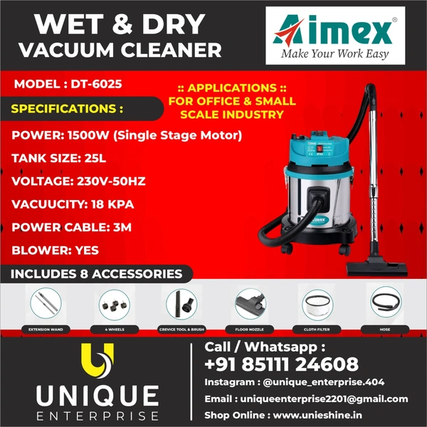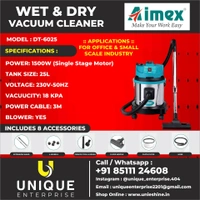 The AIMEX DT-6025 Wet & Dry Vacuum Cleaner is an excellent choice for businesses, offices, workshops, garages, and small industries that require reliable cleaning equipment. With its powerful motor, strong suction, large tank capacity, and versatile cleaning accessories, it provides an efficient solution for maintaining clean and safe environments.