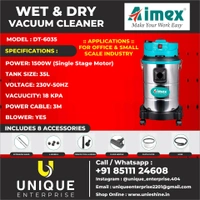 Cleaning large spaces like offices, workshops, and industrial areas often requires more than a regular household vacuum cleaner. The AIMEX DT-6035 Wet & Dry Vacuum Cleaner is designed to deliver powerful cleaning performance for demanding environments. With a strong 1500W motor and 18 kPa suction power, this industrial wet and dry vacuum cleaner easily removes dust, dirt, debris, and liquid spills from multiple surfaces.