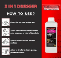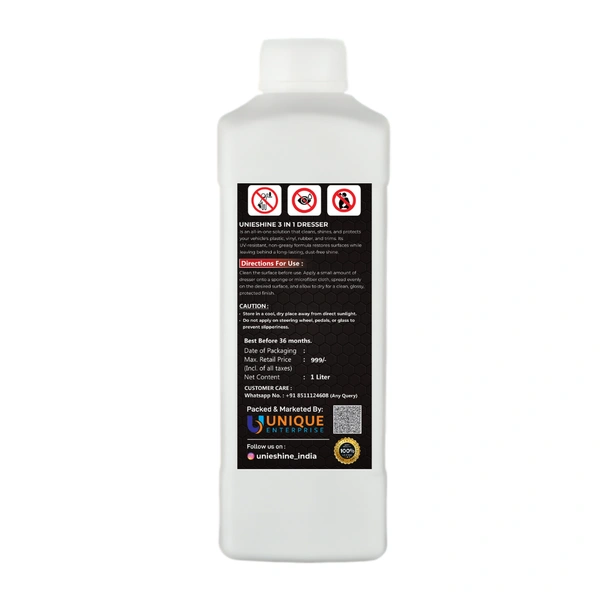 Don't let dull tyres or faded trims ruin your vehicle's look. Upgrade to the UNIESHINE 1L 3 in 1 Dresser and experience the difference. Order now and bring back the shine and protection your car deserves!