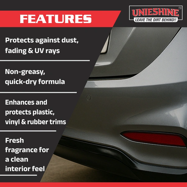 The advanced formula of the UNIESHINE 3 in 1 Dresser delivers more than just a glossy finish. It nourishes and protects surfaces to maintain their appearance and durability over time. Easy to apply and non-greasy, this is your ultimate solution for effortless vehicle detailing.