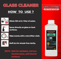 UNIESHINE 1L Concentrated Glass Cleaner is a powerful, high-efficiency formula designed to deliver streak-free cleaning for glass surfaces. Just 1L concentrate can make up to 10L of effective glass cleaner, making it ideal for car windshields, mirrors, and home or office windows.