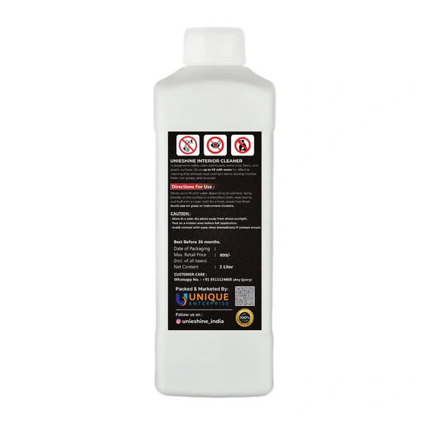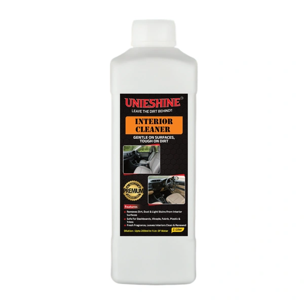 UNIESHINE 1L Concentrated Interior Cleaner is a powerful cleaning solution designed to remove dust, stains, and dirt from car interiors. Its concentrated formula effectively cleans dashboards, seats, plastic trims, and upholstery while helping maintain a fresh and well-maintained interior.