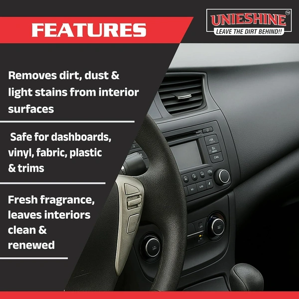 The concentrated formula provides efficient cleaning while making it suitable for regular interior maintenance. It lifts dirt and contaminants from surfaces without leaving heavy residue, making cleaning easier and more effective. UNIESHINE Interior Cleaner is ideal for both professional detailers and car owners who want a neat, hygienic, and well-maintained vehicle interior.