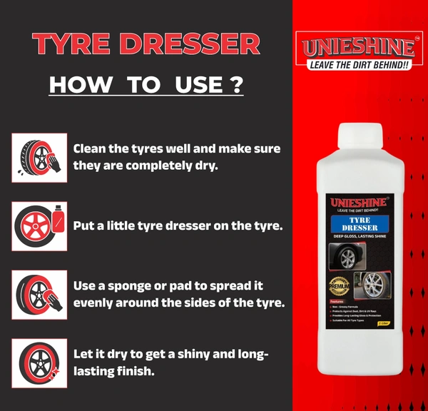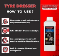 UNIESHINE 1L Tyre Dresser is a premium cream-based tyre polish designed to restore deep black shine and protect tyres from fading, dust, and environmental damage. Its easy-to-apply formula delivers a long-lasting glossy finish for a clean, well-maintained look.