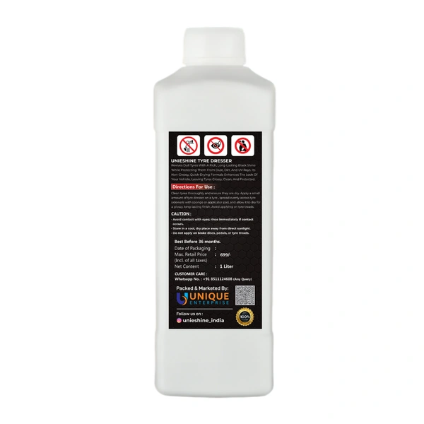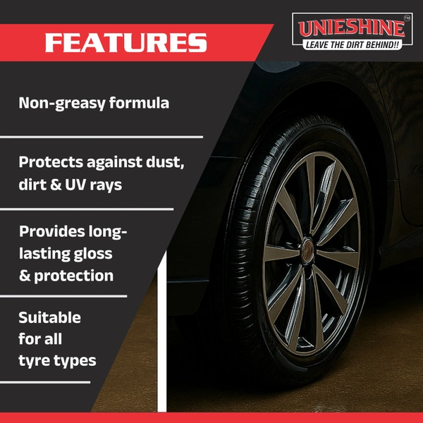 Bring back the rich black shine of your vehicle’s tyres with UNIESHINE 1L Tyre Dresser, a high-quality cream-based tyre polish designed for superior appearance and protection. The advanced formula enhances the natural look of tyres while creating a smooth, glossy finish that improves the overall appearance of your vehicle.