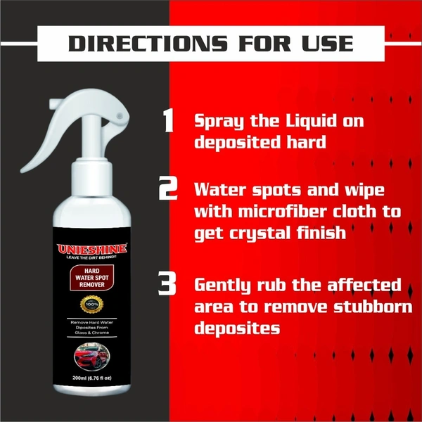 UNIESHINE 200ML Hard Water Spot Remover is specially designed to remove stubborn water marks and mineral deposits from car surfaces caused by hard water. Ideal for Indian conditions, it restores clarity on glass, paint, and exterior surfaces. Supplied with a microfiber cloth for safe and effective application.