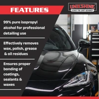 UNIESHINE IPA (Isopropyl Alcohol) Surface Prep Spray is formulated to help remove polishing oils, wax residues, fingerprints, light grime and contaminants from painted, metal and hard surfaces. Commonly used as a panel wipe or surface prep step, it helps prepare surfaces before polishing, sealant application or detailing work.