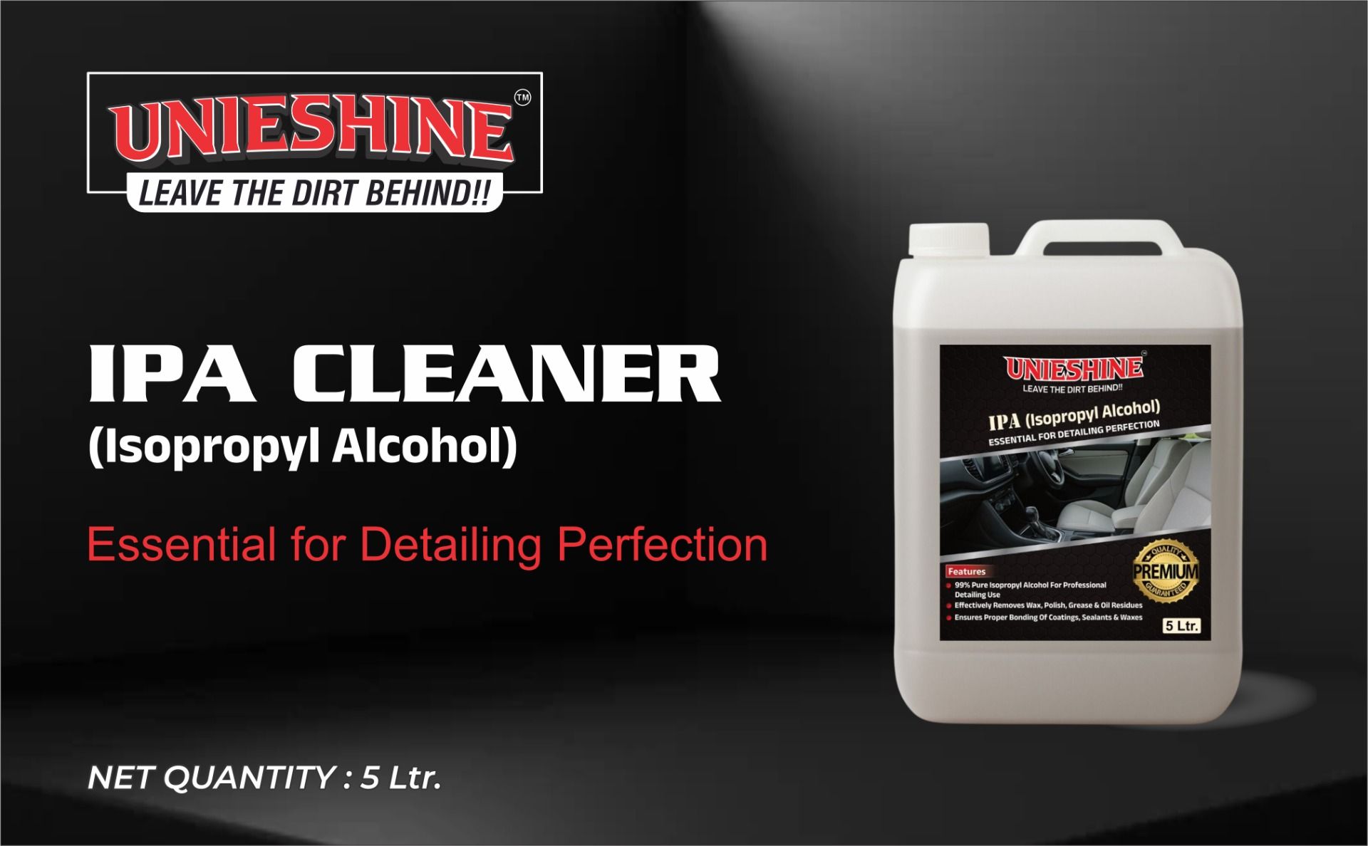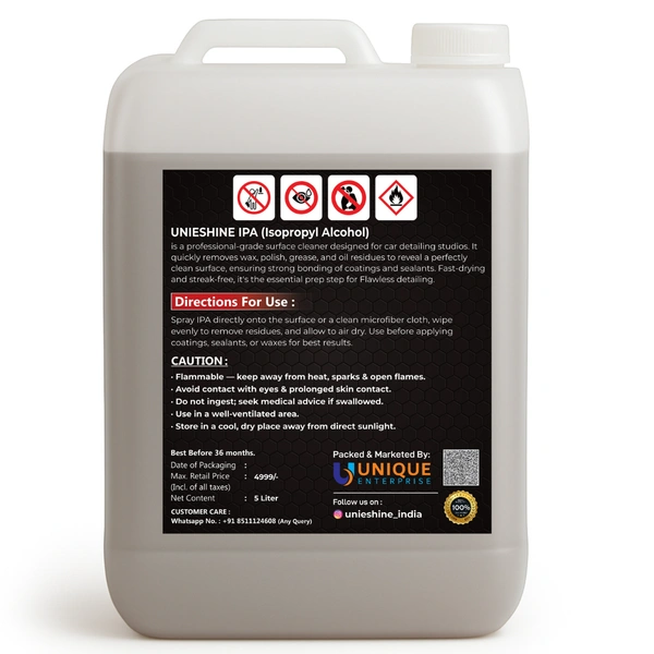 Prepare surfaces the professional way with UNIESHINE 5L IPA Isopropyl Alcohol. This high-purity surface prep cleaner effectively removes oil, grease, dirt, adhesive residue, and wax buildup, ensuring a perfectly clean surface before polishing, paint correction, or ceramic coating application. Ideal for car and bike detailing, it delivers reliable, streak-free preparation results.