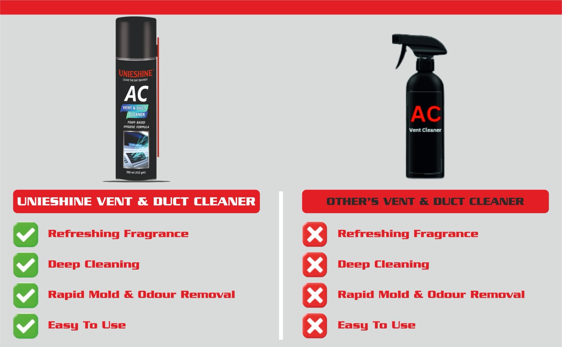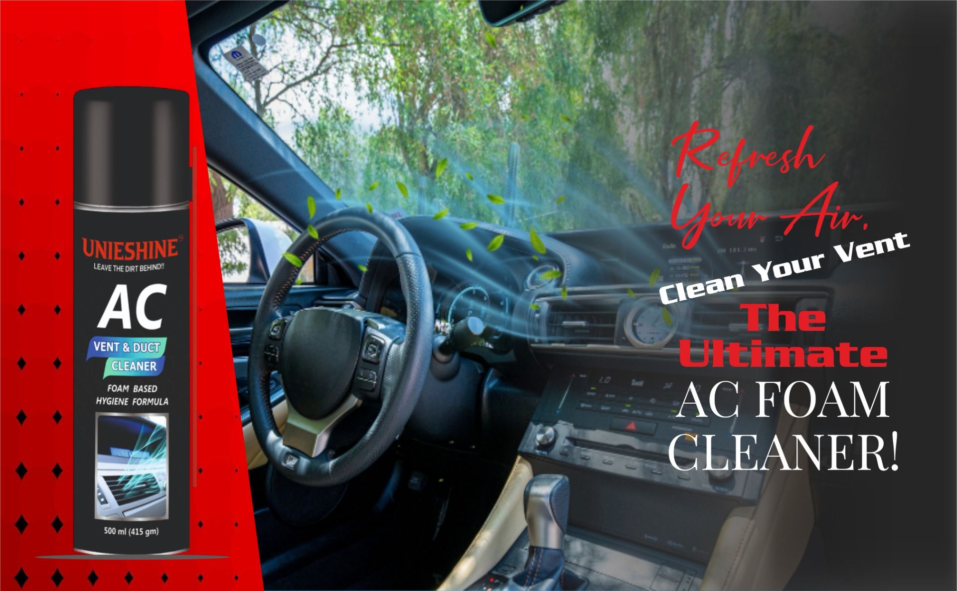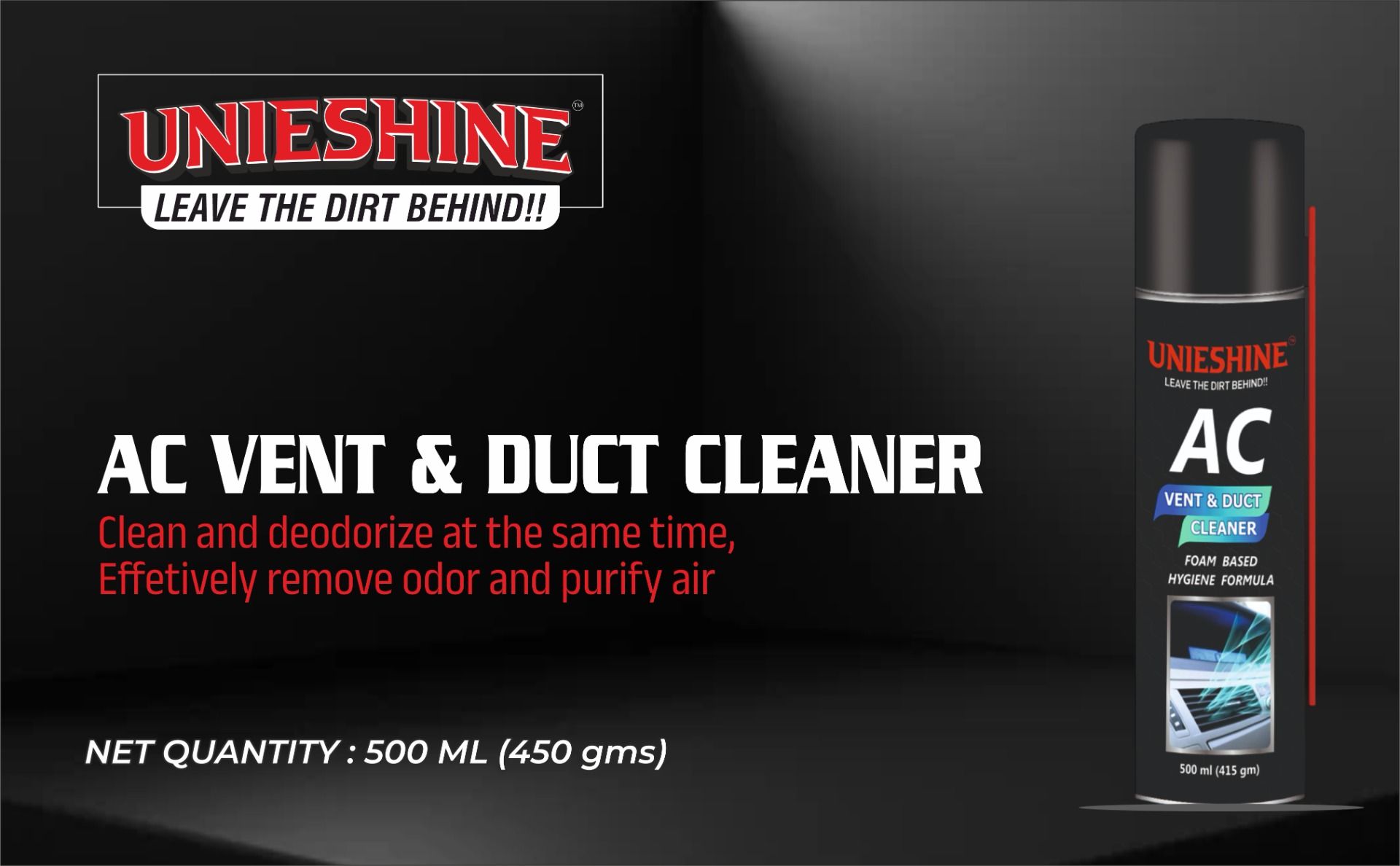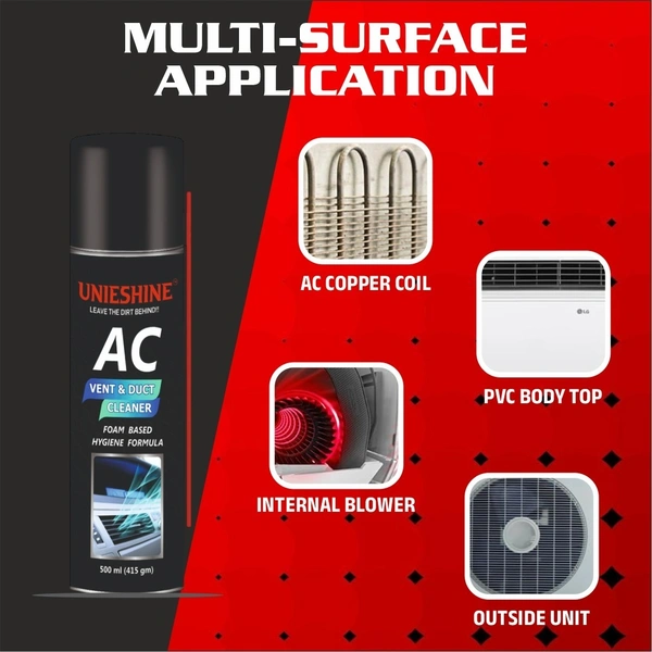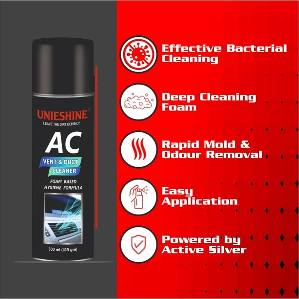 UNIESHINE AC Vent and Duct Cleaner 500ML is a powerful antibacterial foam spray designed for car and home air conditioning systems. It cleans AC coils, vents, and ducts by removing dust, bacteria, and musty odors while neutralizing unpleasant smells for fresher air.