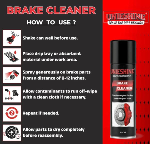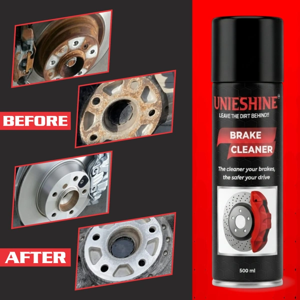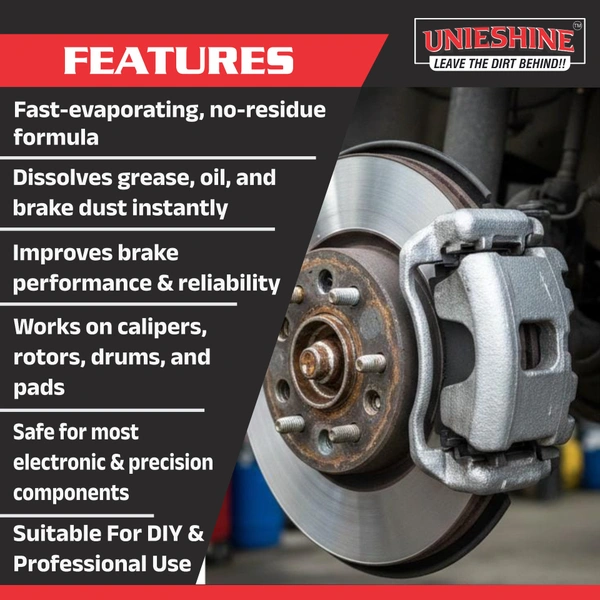 UNIESHINE Brake Cleaner Spray is a fast-drying, residue-free cleaning spray formulated to remove brake dust, oil, grease, grime, and contaminants from disc brakes and brake components. Designed for cars, bikes, and workshop use, it supports cleaner braking parts, helps reduce contamination-related noise, and assists routine brake maintenance.