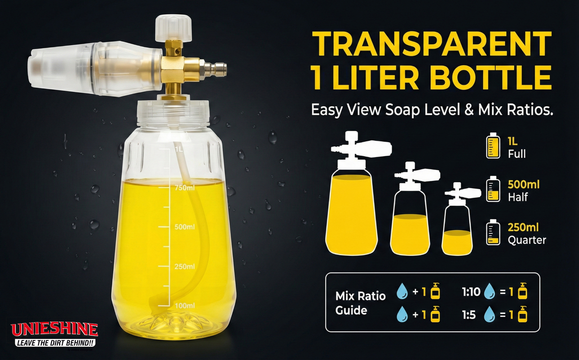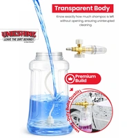 Equipped with a 1-liter transparent bottle, it provides ample capacity for extended cleaning sessions while allowing you to monitor soap levels easily. The ergonomic design ensures a comfortable grip and hassle-free attachment to most pressure washers, making it a convenient and efficient tool for car enthusiasts and professionals alike.