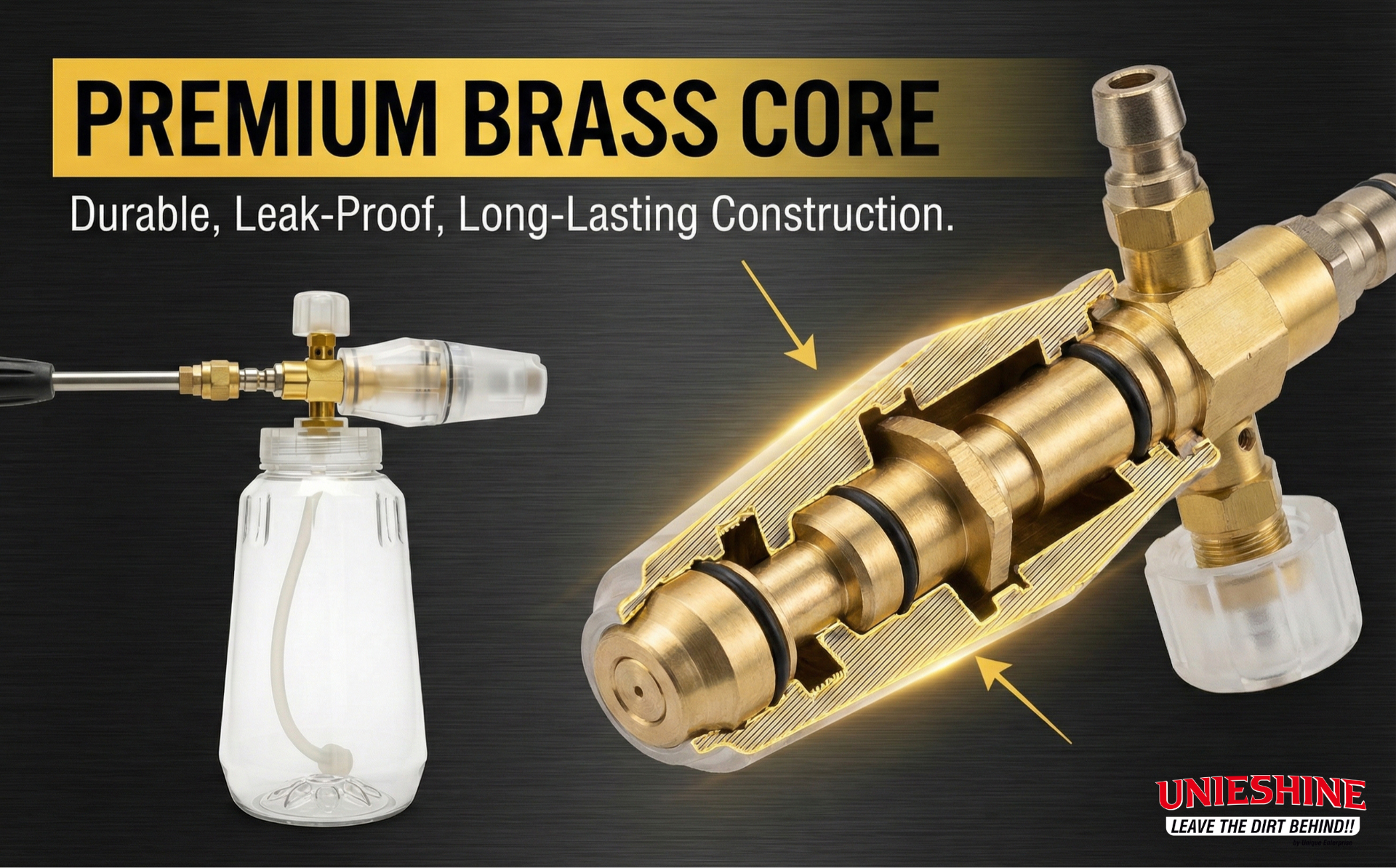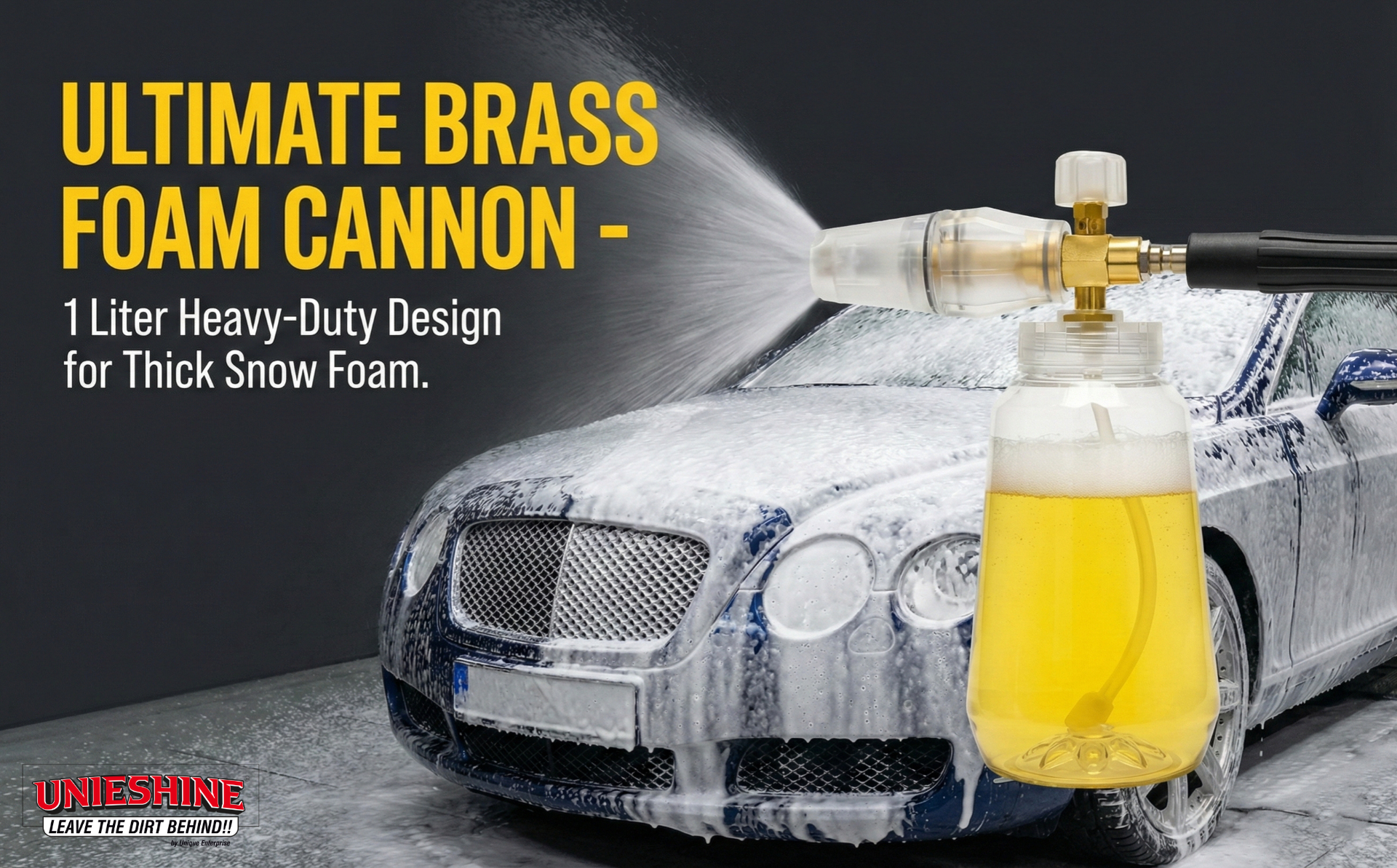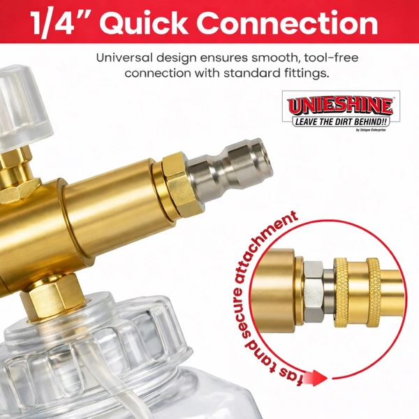 The UNIESHINE Brass Adjustable Foam Cannon is a premium car cleaning tool designed to deliver thick, rich snow foam for effective and safe vehicle washing. Featuring a durable brass core and a 1-liter transparent bottle, this heavy-duty foam lance ensures precise foam control, easy monitoring, and professional-grade detailing results when used with pressure washers.