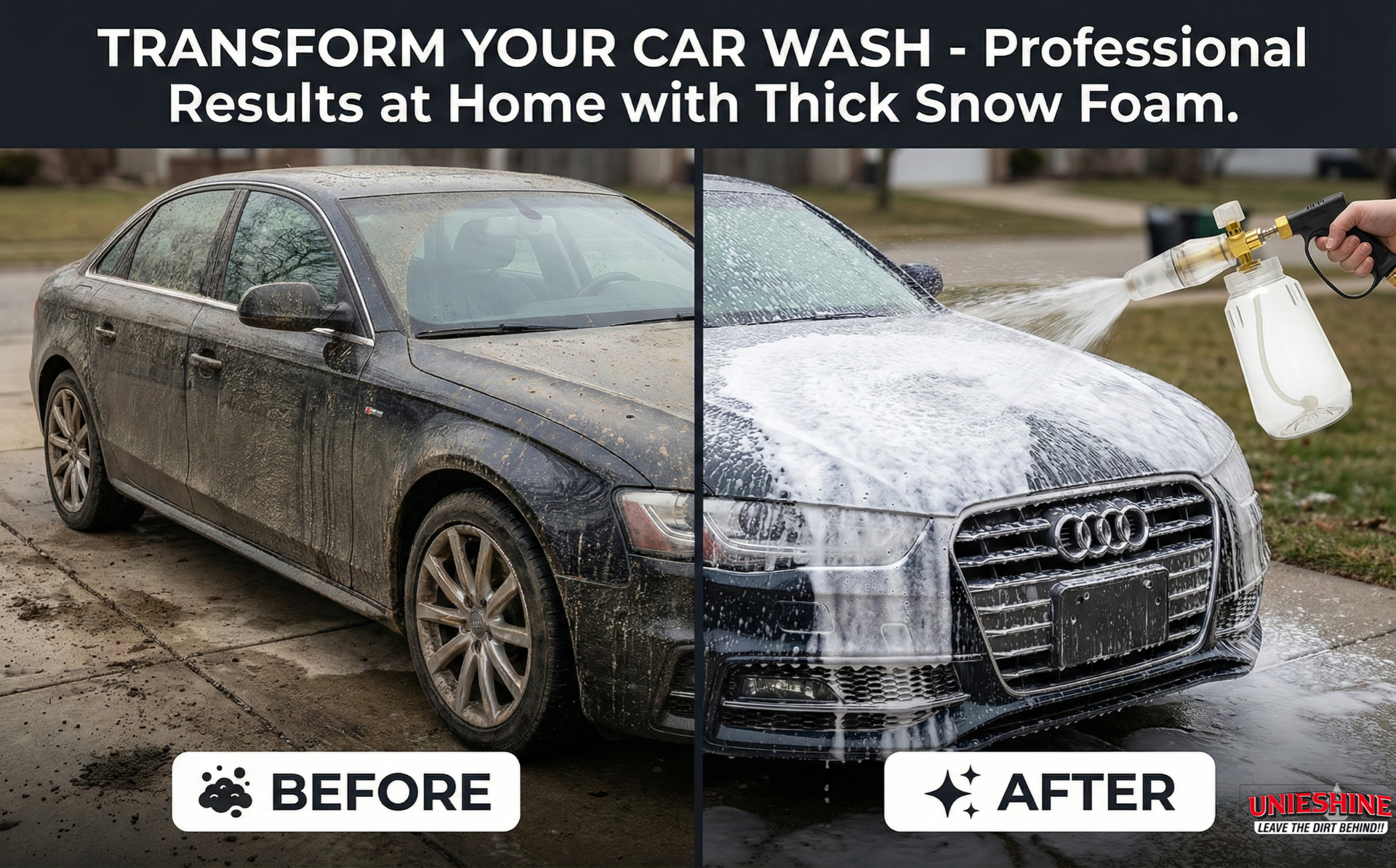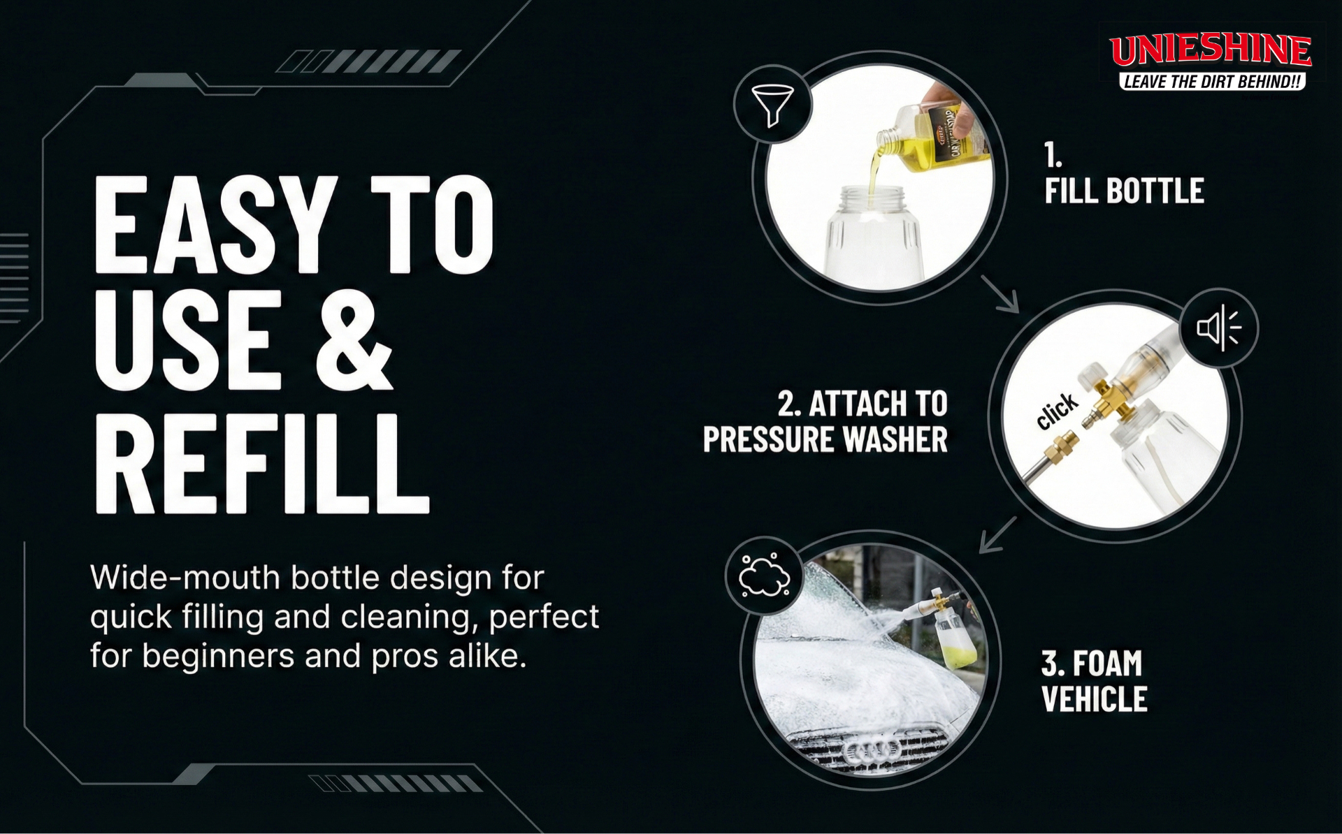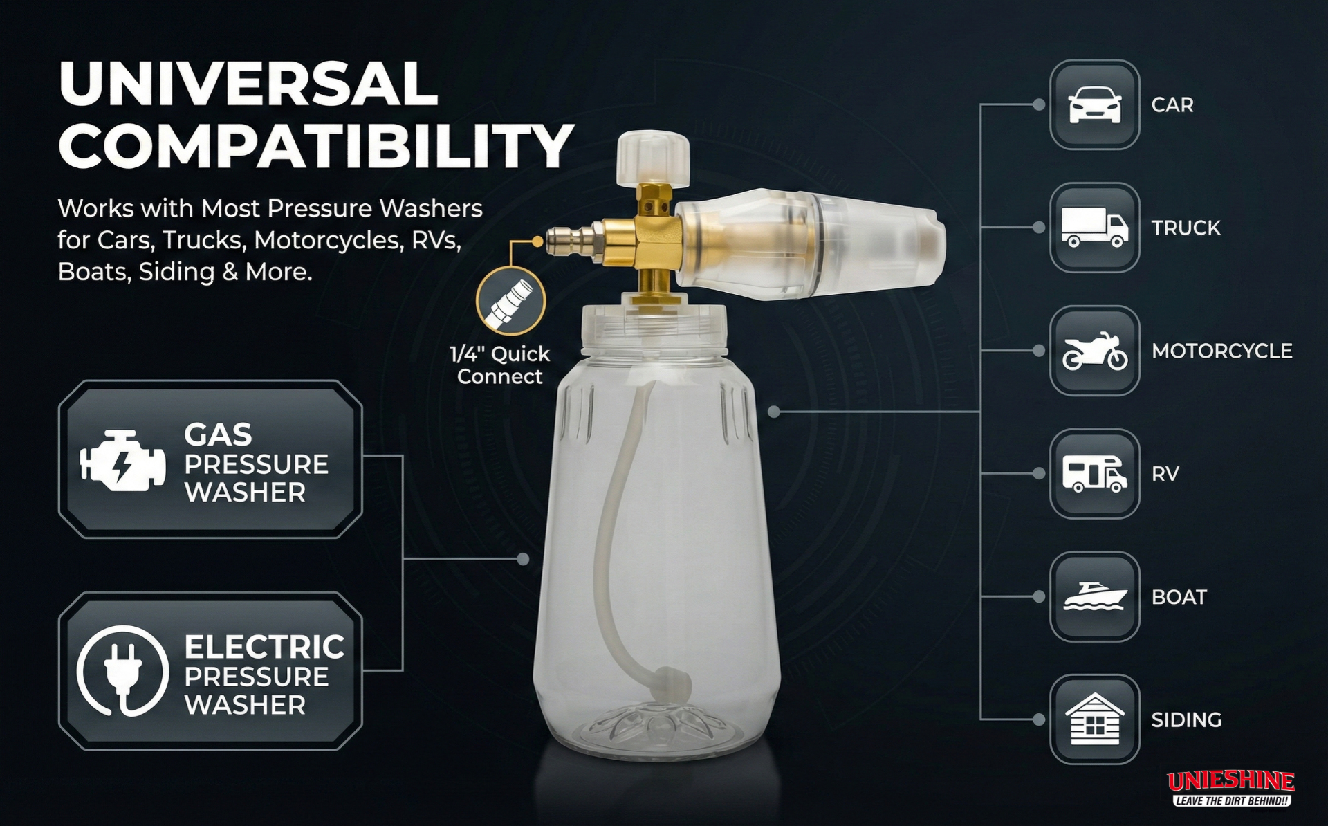 Perfect for cars, bikes, SUVs, and even outdoor surfaces, the UNIESHINE Foam Cannon enhances your detailing process by reducing scratches and swirl marks. Achieve a showroom-quality finish with minimal effort using this powerful and reliable foam blaster.