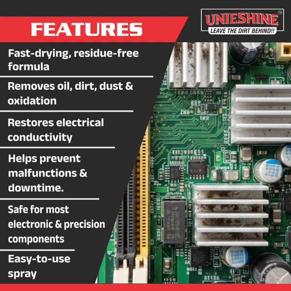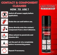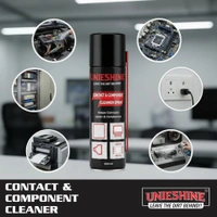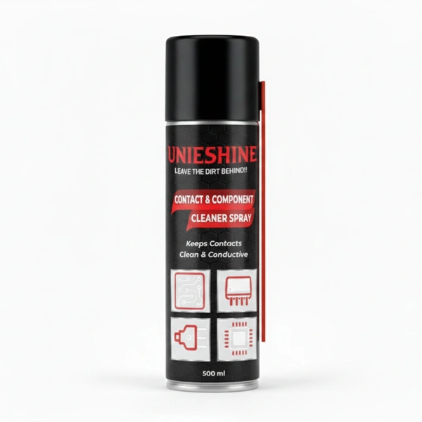 UNIESHINE Contact & Component Cleaner Spray is a fast-drying, non-conductive cleaning solution designed to remove dust, oil, oxidation, flux residue, moisture, and contaminants from electrical contacts, PCB components, sensors, switches, and automotive connectors. Its residue-free formula supports cleaner electrical connections and reliable maintenance.