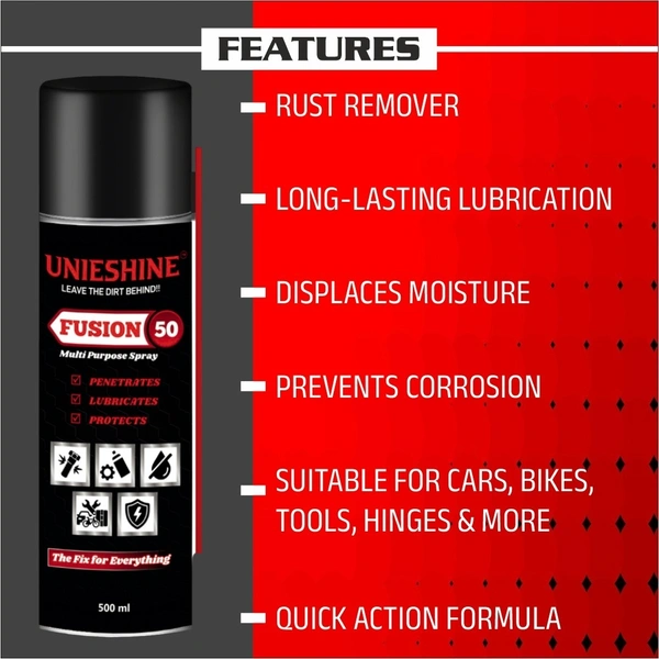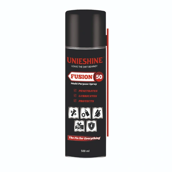 UNIESHINE Fusion-50 Multipurpose Spray is an all-in-one maintenance solution designed to loosen rusted parts, lubricate moving components, displace moisture, reduce squeaks, and help protect metal surfaces. Suitable for automotive, bike, home, tools, machinery, and industrial applications, this versatile spray supports everyday maintenance and corrosion prevention.