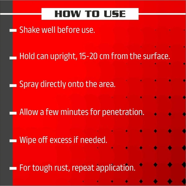 Shake well before use. Spray directly on target area and allow penetration time where needed. Wipe excess product if required. For electrical or sensitive equipment, follow manufacturer recommendations.