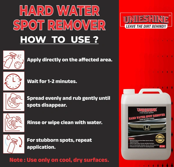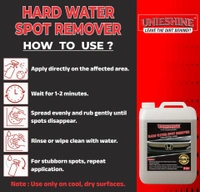 UNIESHINE Hard Water Spot Remover 5L is a high-performance descaling solution formulated to remove tough hard water stains, limescale buildup, and mineral deposits from a wide range of surfaces. It effectively restores clarity to car glass and mirrors while reviving the shine of chrome fittings, tiles, and metal surfaces. The fast-acting formula breaks down stubborn white spots and residue without excessive scrubbing, making cleaning quicker and more efficient.