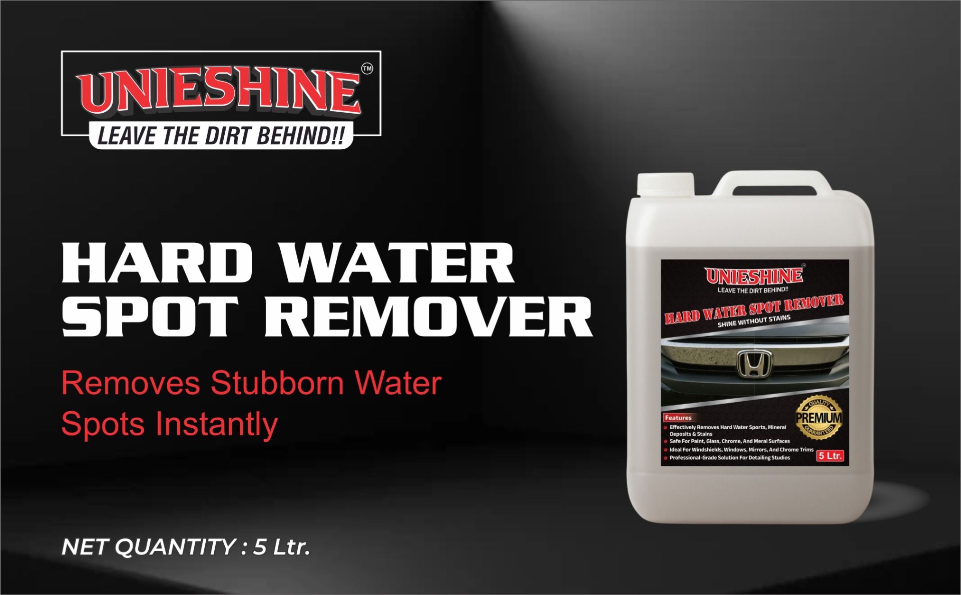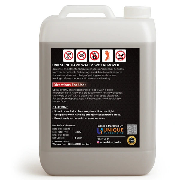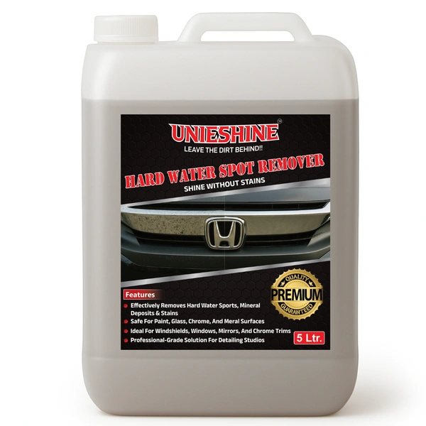 Eliminate stubborn mineral deposits with UNIESHINE Hard Water Spot Remover 5L. This powerful limescale and stain remover quickly dissolves hard water marks on car glass, chrome, tiles, mirrors, taps, and bathroom or kitchen surfaces. Designed for fast descaling and shine restoration, it brings back clarity and a spotless finish to affected areas.