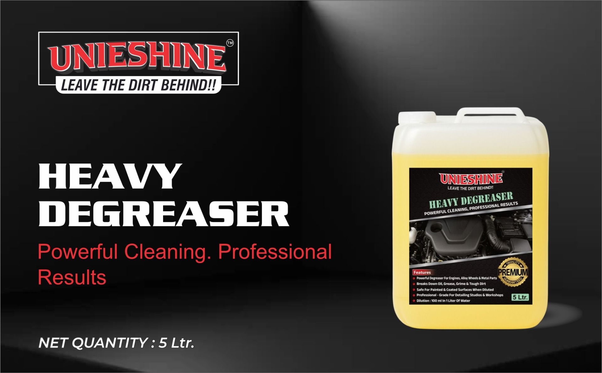 Tackle tough grease and grime with UNIESHINE Heavy Duty Perfect Degreaser 5L. This professional-grade multi-purpose cleaner features a powerful 1:9 dilution formula designed to remove oil, dirt, brake dust, and heavy buildup from engines, wheel rims, iron parts, and vehicle components. Ideal for cars, bikes, trucks, and commercial vehicles, it delivers deep cleaning performance with economical usage.