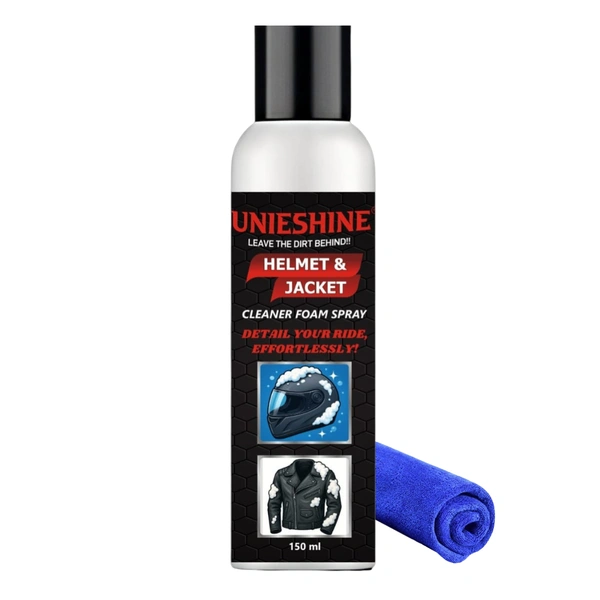 UNIESHINE Helmet & Jacket Cleaner Foam Spray 150ML with Microfiber Cloth | Quick-Dry No-Rinse Riding Gear Cleaner | Removes Dirt, Sweat & Odor | Safe for All Helmet & Jacket Materials