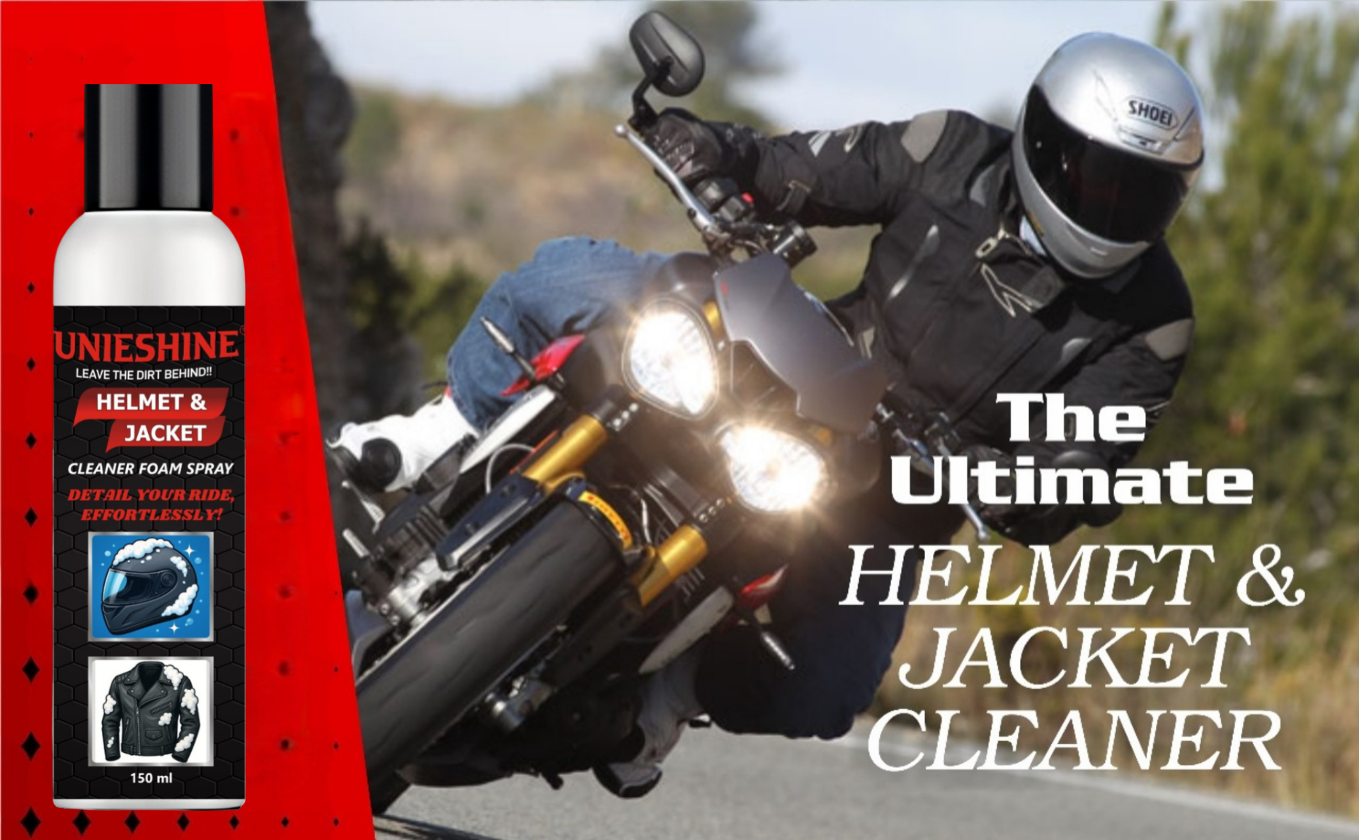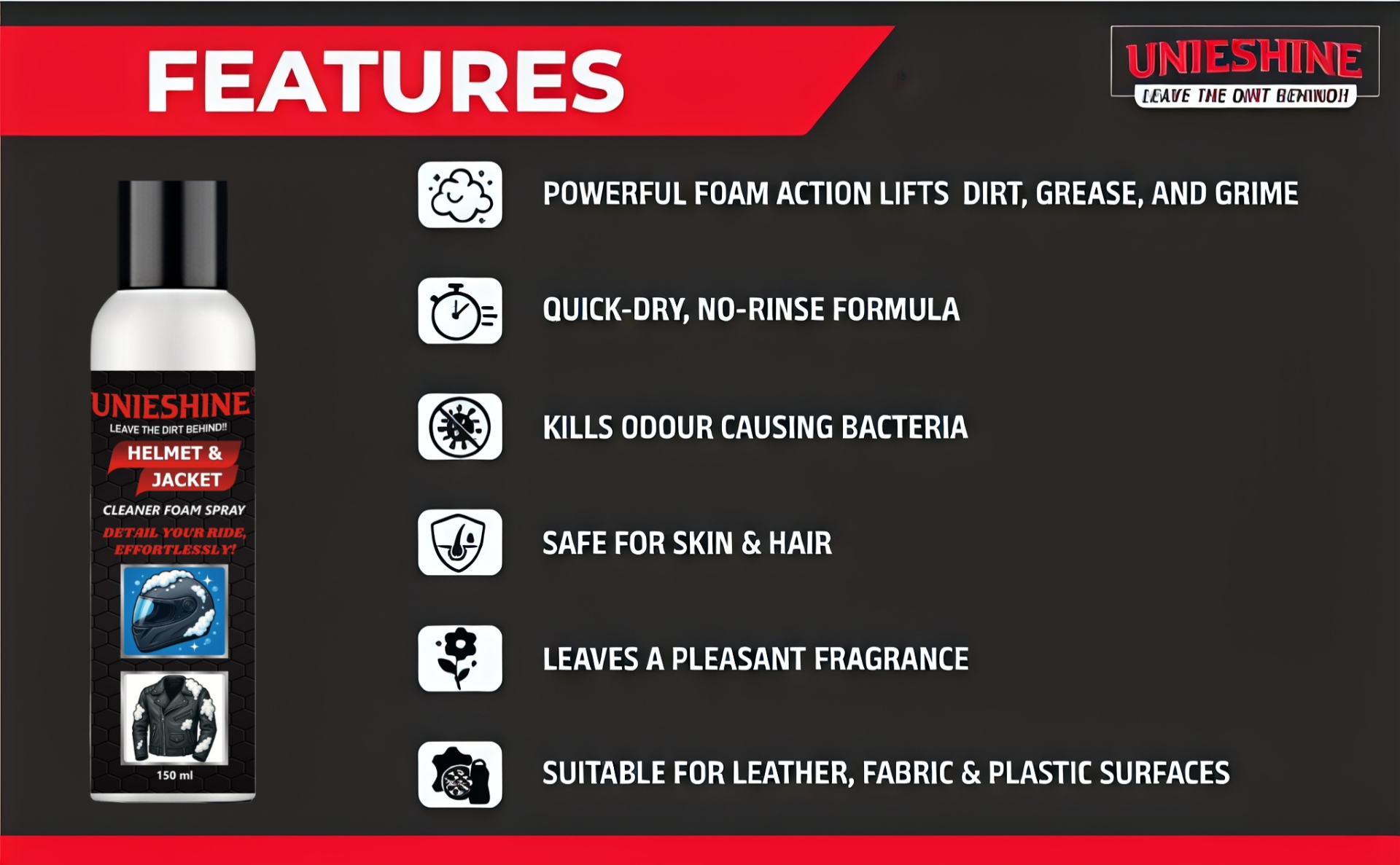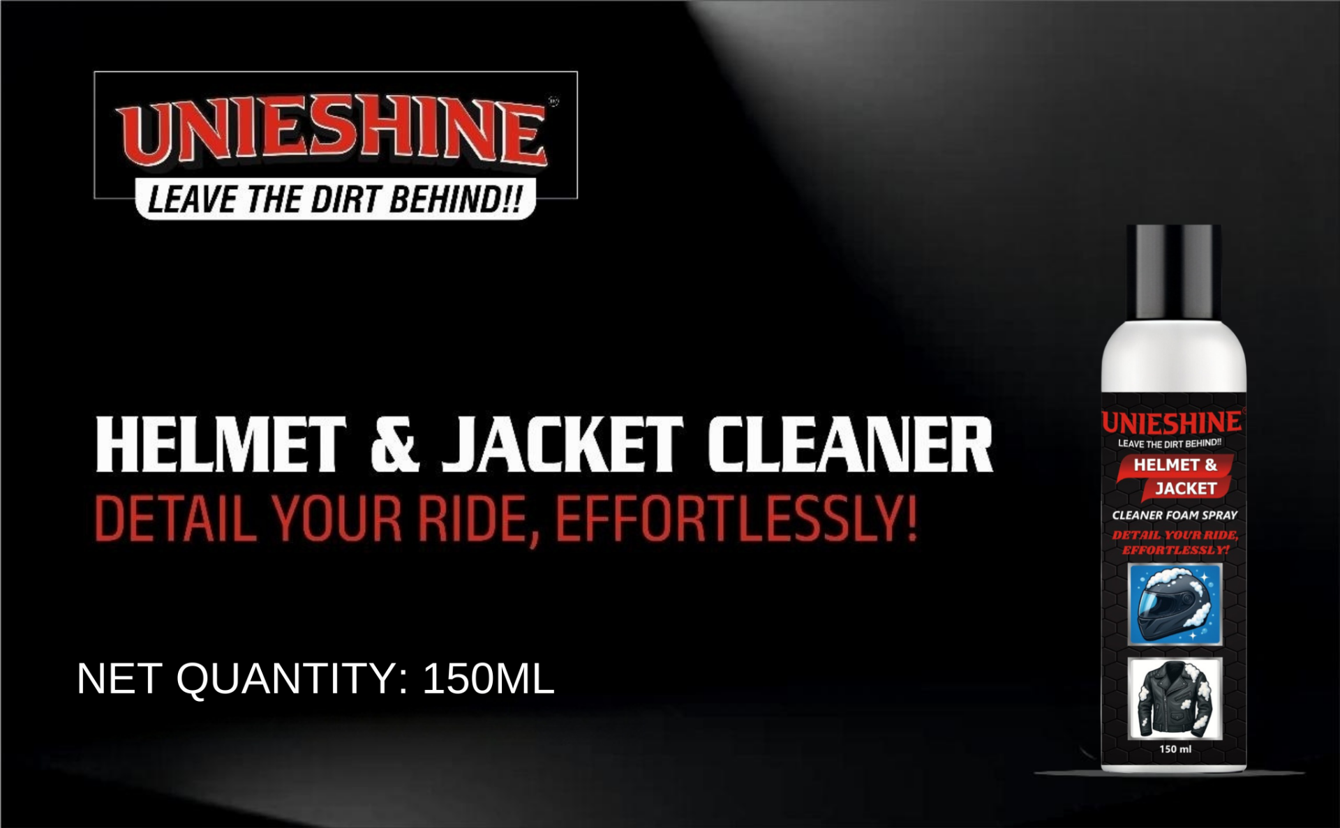 UNIESHINE Helmet & Jacket Cleaner Foam Spray 150ML with Microfiber Cloth is a complete riding gear cleaning solution designed for fast, effective maintenance. The advanced foam formula lifts dirt, sweat residue, and odors from helmets, jackets, gloves, and protective gear without the need for rinsing. Its quick-dry action leaves surfaces clean, fresh, and residue-free, making it ideal for regular use after rides.