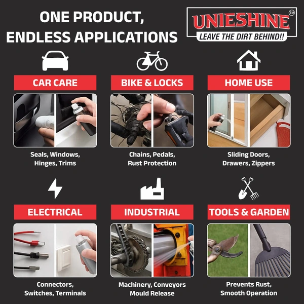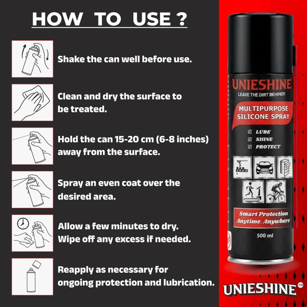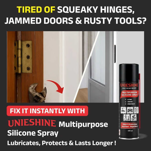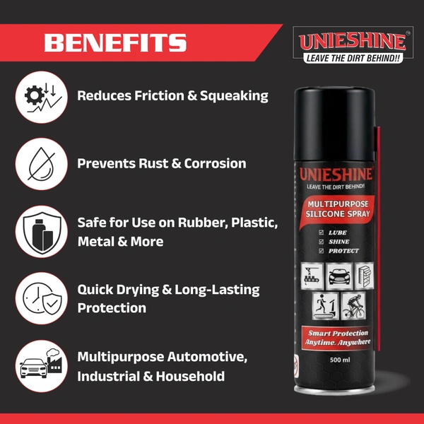 Protect, lubricate, and maintain with UNIESHINE Multipurpose Silicone Spray 500ML, a high-performance silicone-based spray formulated for smooth lubrication and surface protection across automotive, industrial, household, and fitness equipment applications.