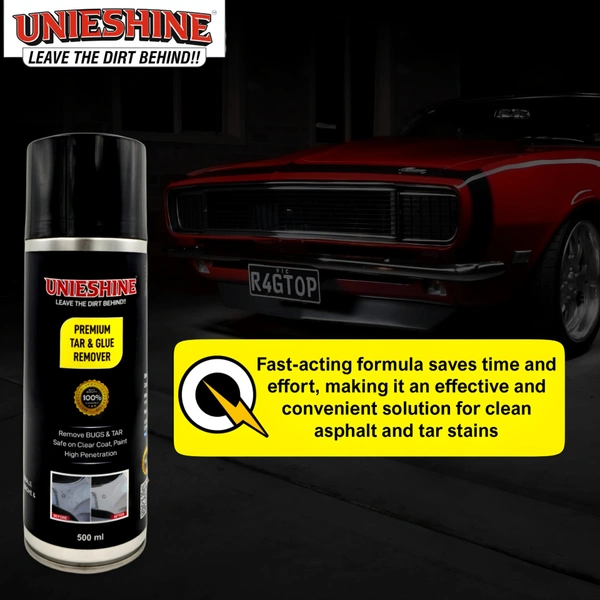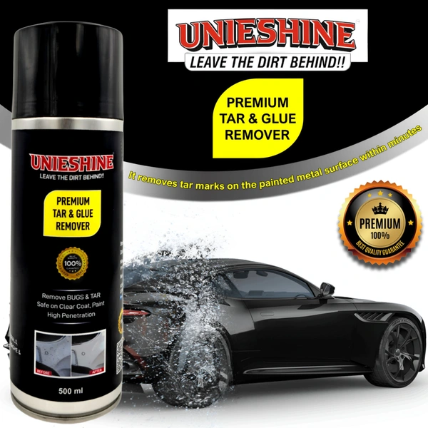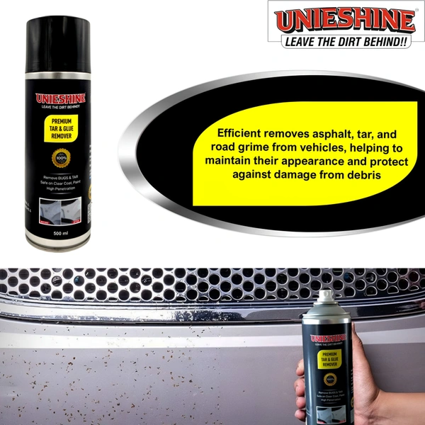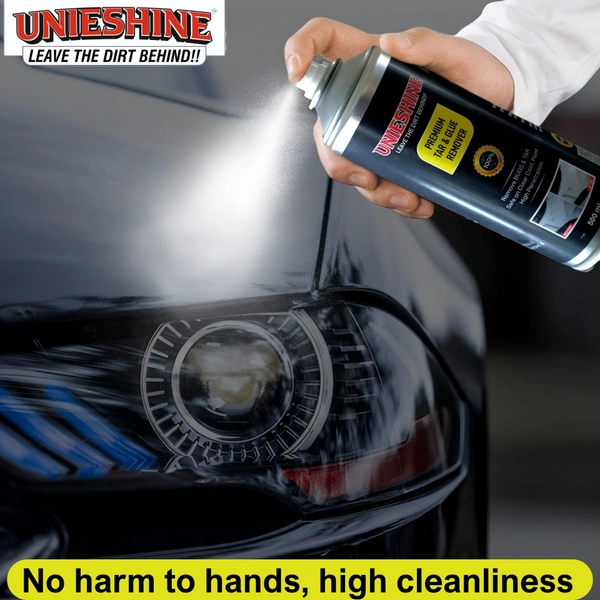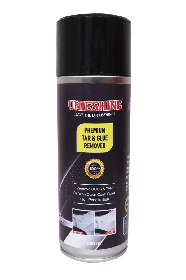UNIESHINE Tar, Glue & Bug Remover Spray is a fast-acting cleaning solution designed to break down stubborn tar spots, adhesive residue, bug splatter, road grime, grease, and surface stains. Safe for use on cars, glass, painted surfaces, chrome, and exterior trims, its easy-to-use formula helps restore a clean, residue-free finish.