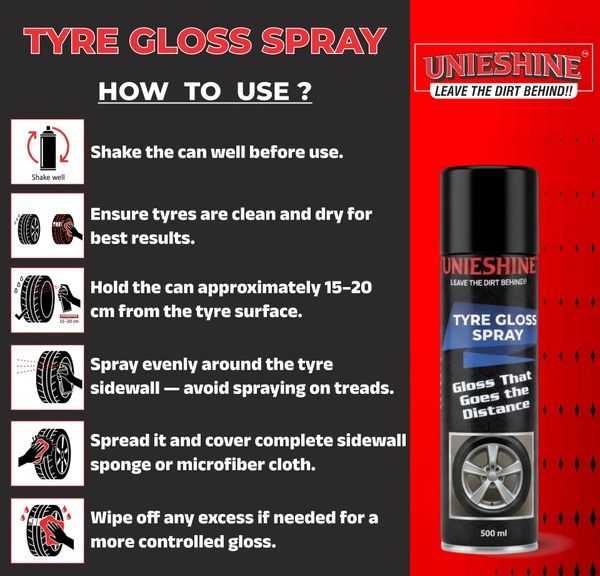 Enhance and protect your tires with UNIESHINE Tyre Gloss Spray 500ML, a high-performance tire dressing formulated to deliver a deep black finish and long-lasting wet look shine while helping maintain rubber condition.