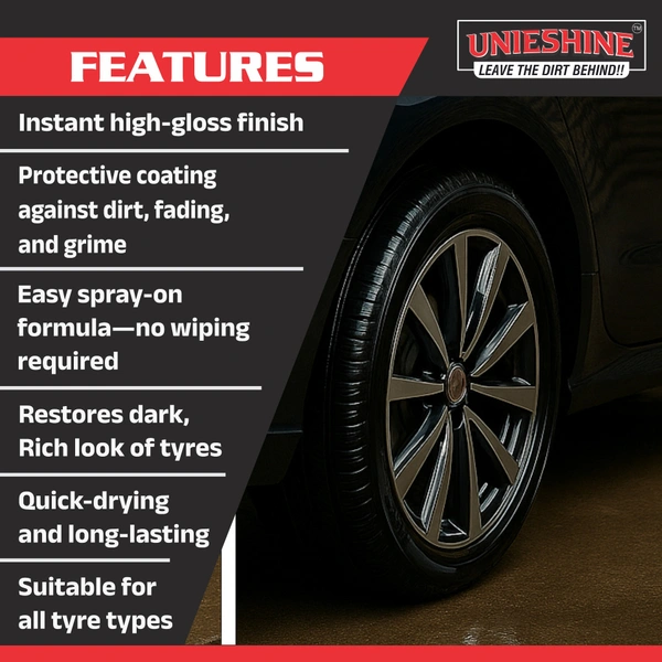 Daily exposure to sunlight, dust, road grime, and weather can make tires look dull and dry. UNIESHINE Tyre Gloss helps restore a richer appearance, improve visual depth, and provide a protective coating that supports resistance to fading and drying caused by UV exposure.